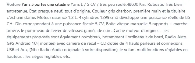 Voiture Yaris 5 portes une citadine Yaris E / 5 CV / très peu roulé, 48600 Km, Robuste, Très bien entretenue, Etat presque neuf, tout d'origine, Couleur gris charbon, première main et la titulaire c'est une dame, Moteur essence 1.2 L, 4 cylindres 1299 cm3 développe une puissance réelle de 85 CH- Din correspondant à une puissance fiscale 5 CV, Boite vitesse manuelle 5 rapports + marche arrière, le pommeau de levier de vitesses gainés de cuir , Cache moteur d'origine, - Les équipements proposés sont également nombreux, notamment l’ordinateur de bord, Radio Auto GPS Android 10'( montée) avec caméra de recul – CD dotée de 4 hauts parleurs et connexions USB et Aux, (Nb : Radio Audio originale à votre disposition), le volant multifonctions réglables en hauteur, , les sièges réglables, etc.